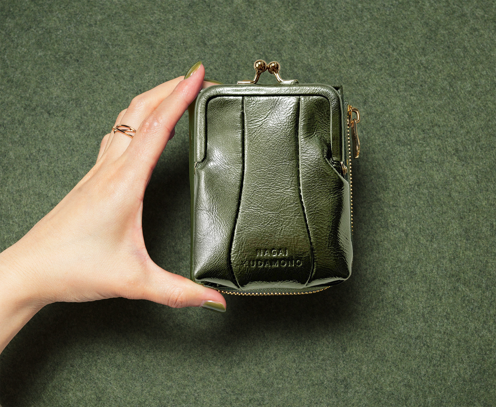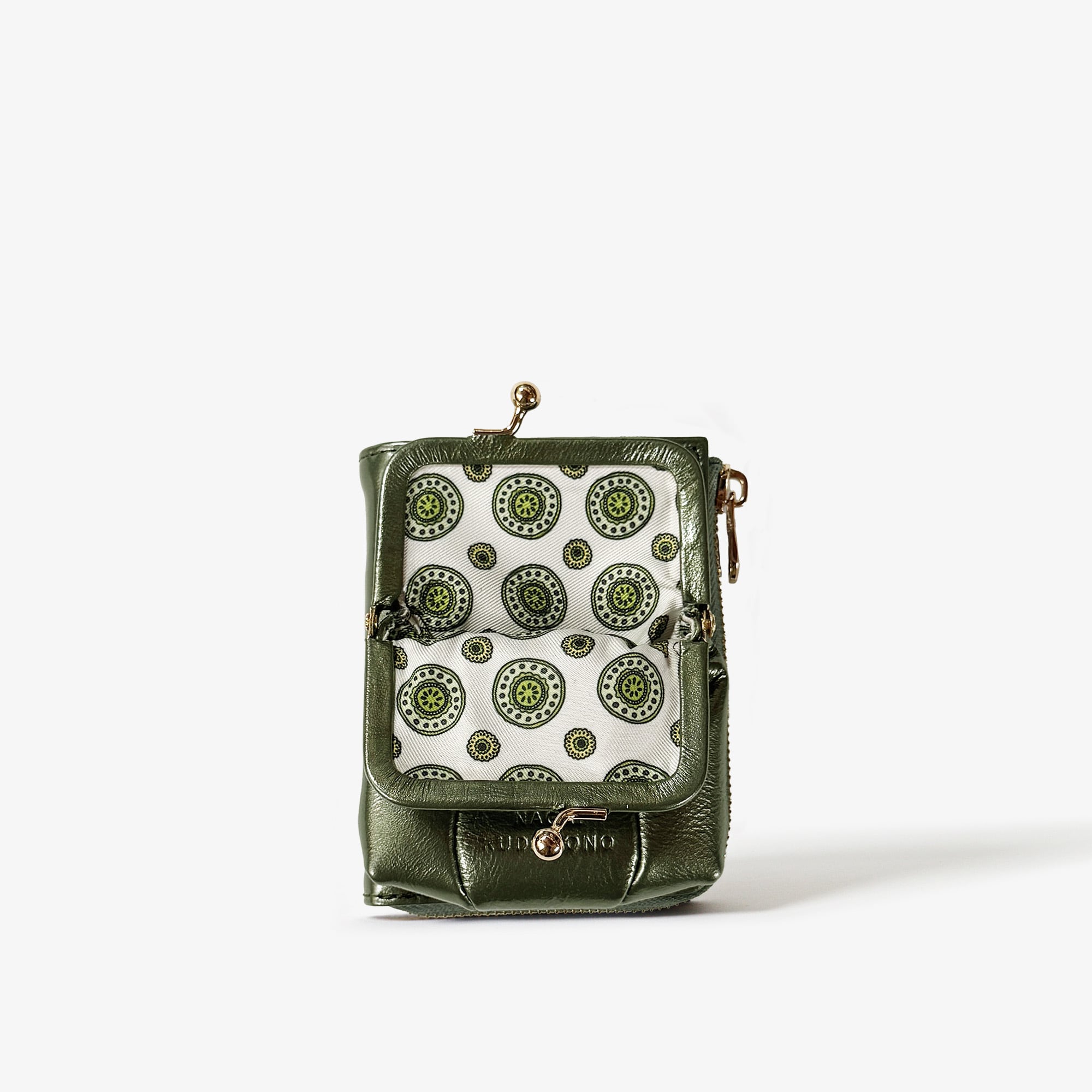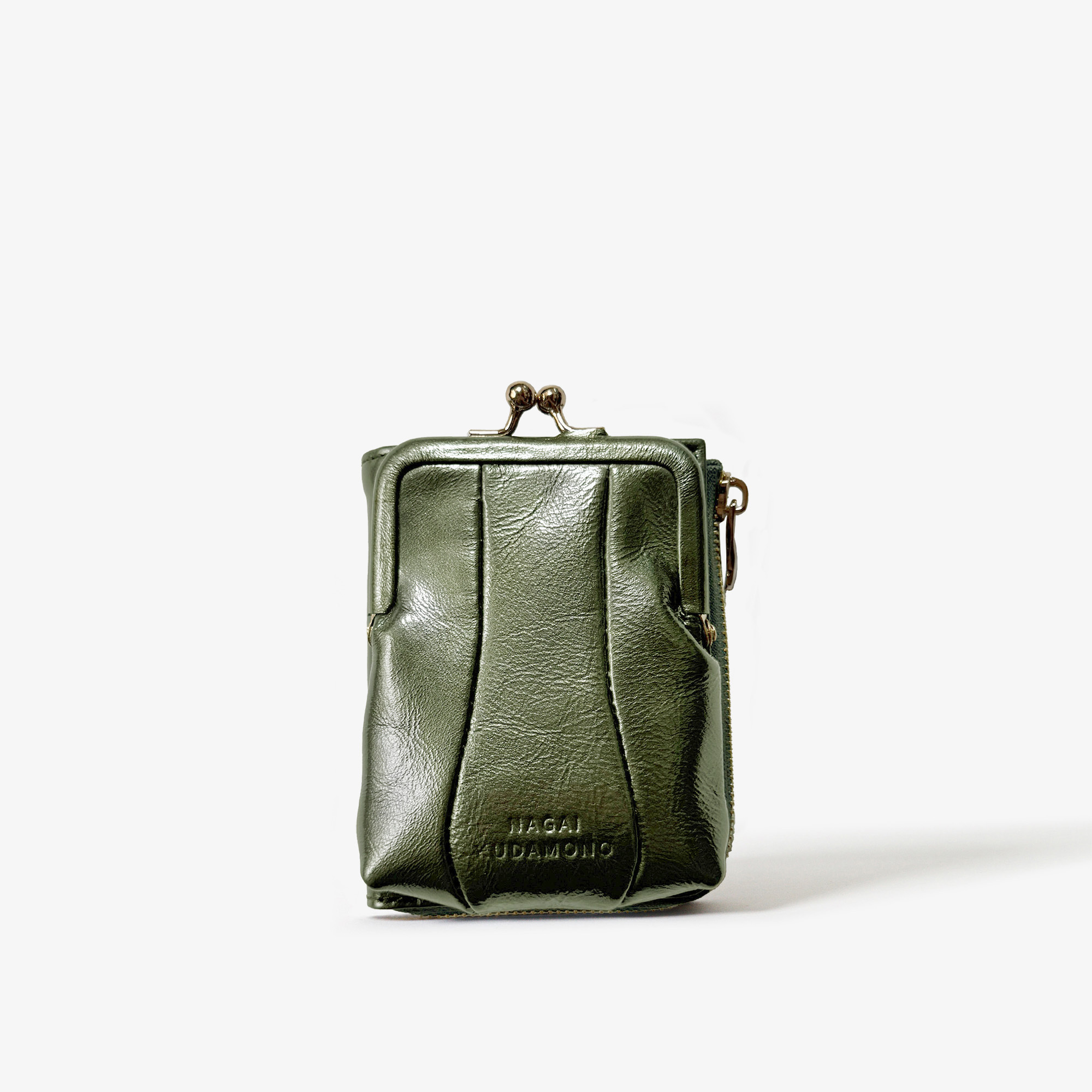 正面のがま口ポーチは、カードや小物をたくさん入れても型崩れしづらい、まるみのある独特なかたち
