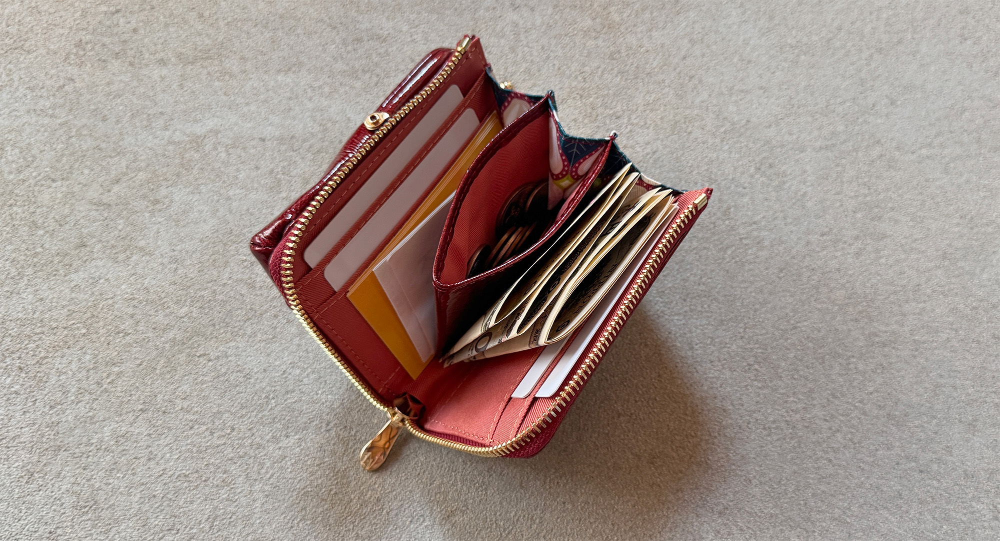 お札はコインケースの横に折りたたんで収納すれば、10枚程度は無理なくスッキリ入ります