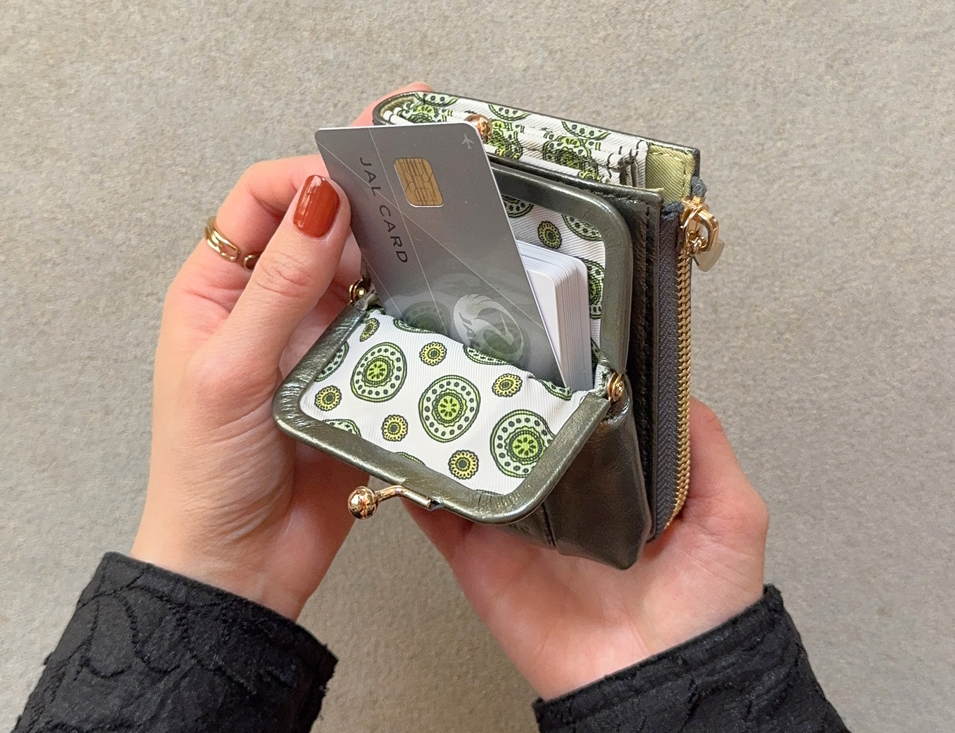 決済の時には、バッグの中でがま口を開け、クレジットカードをスッと出してピッ