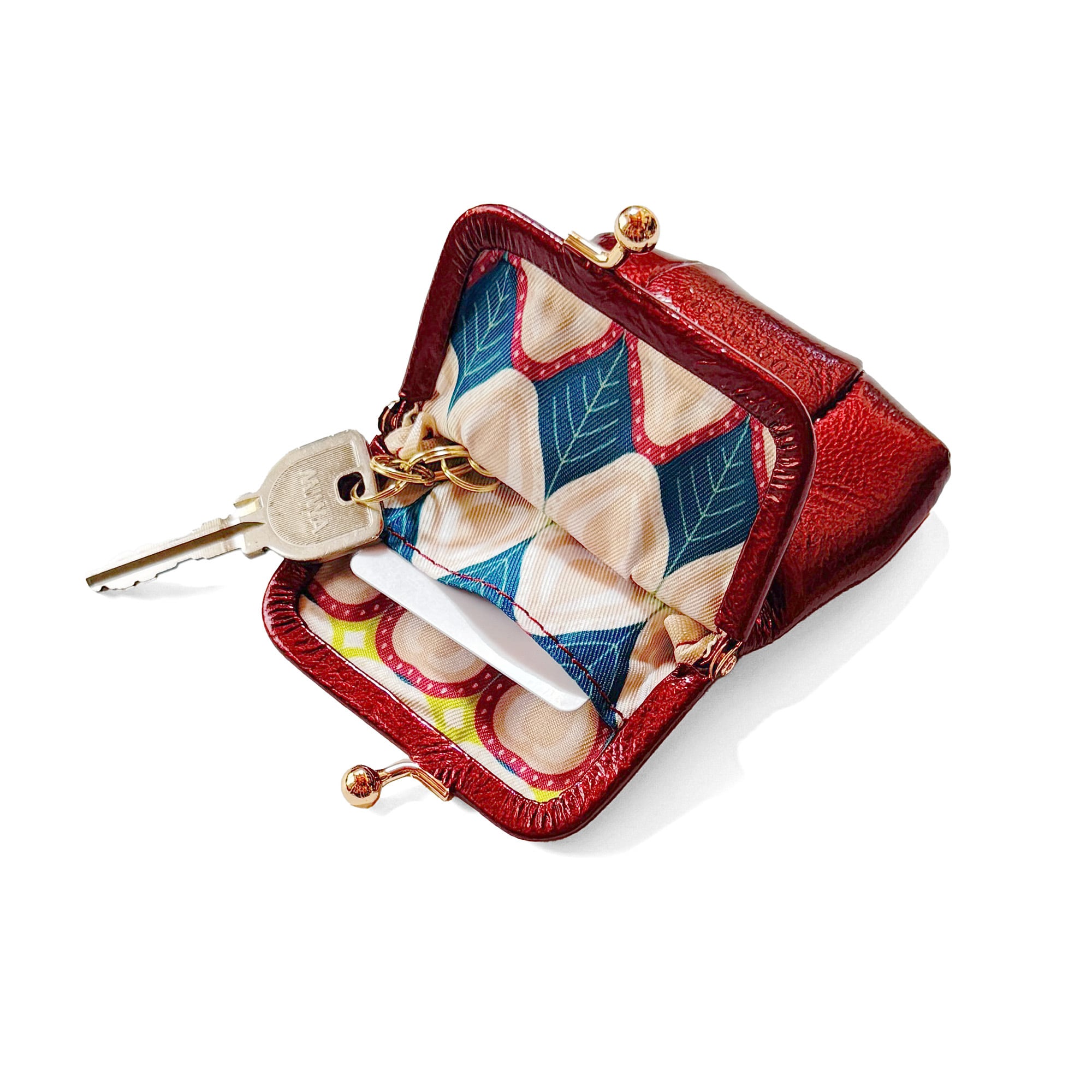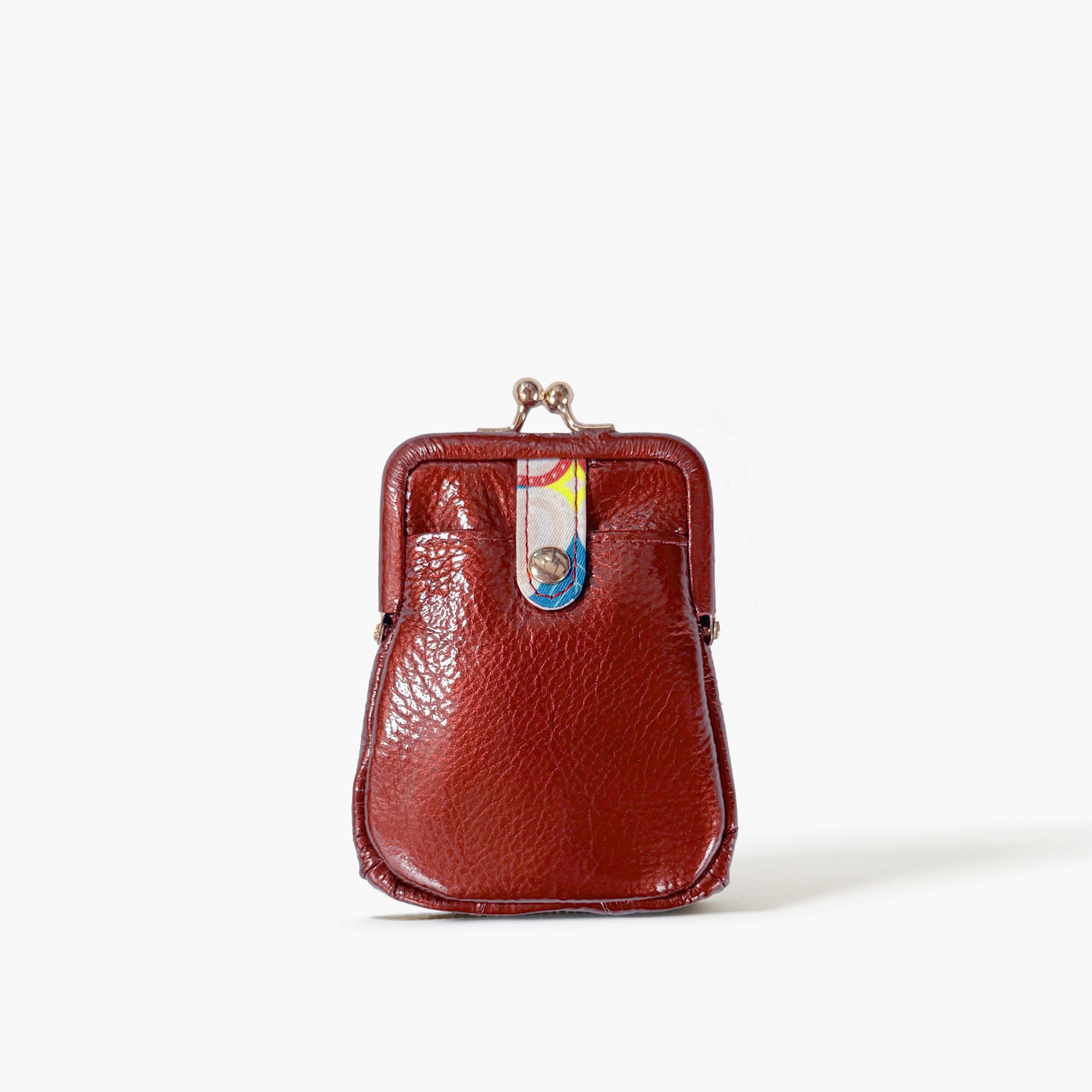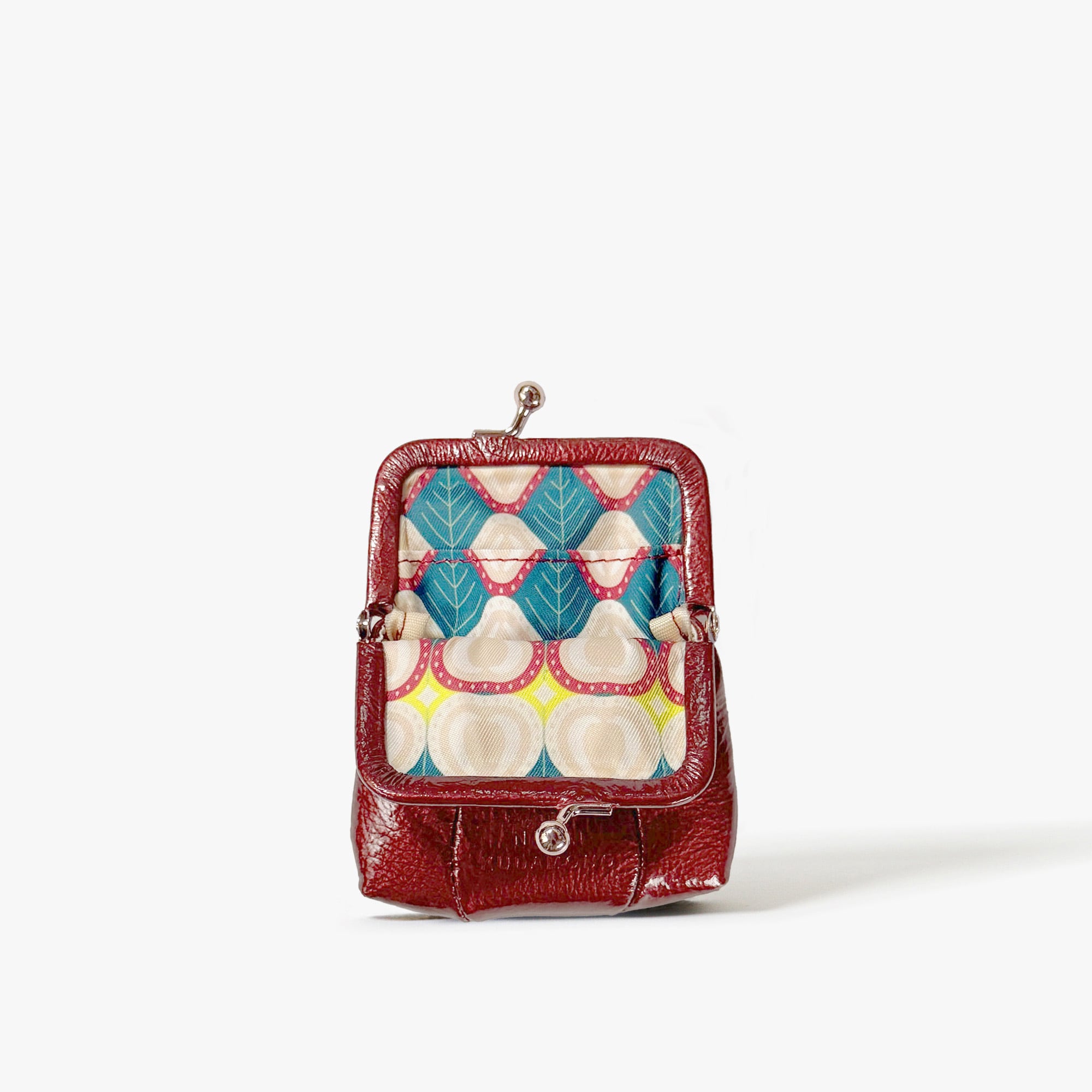 がま口の内側と本体のマチは、カラフルでレトロな雰囲気が漂うオリジナルテキスタイル