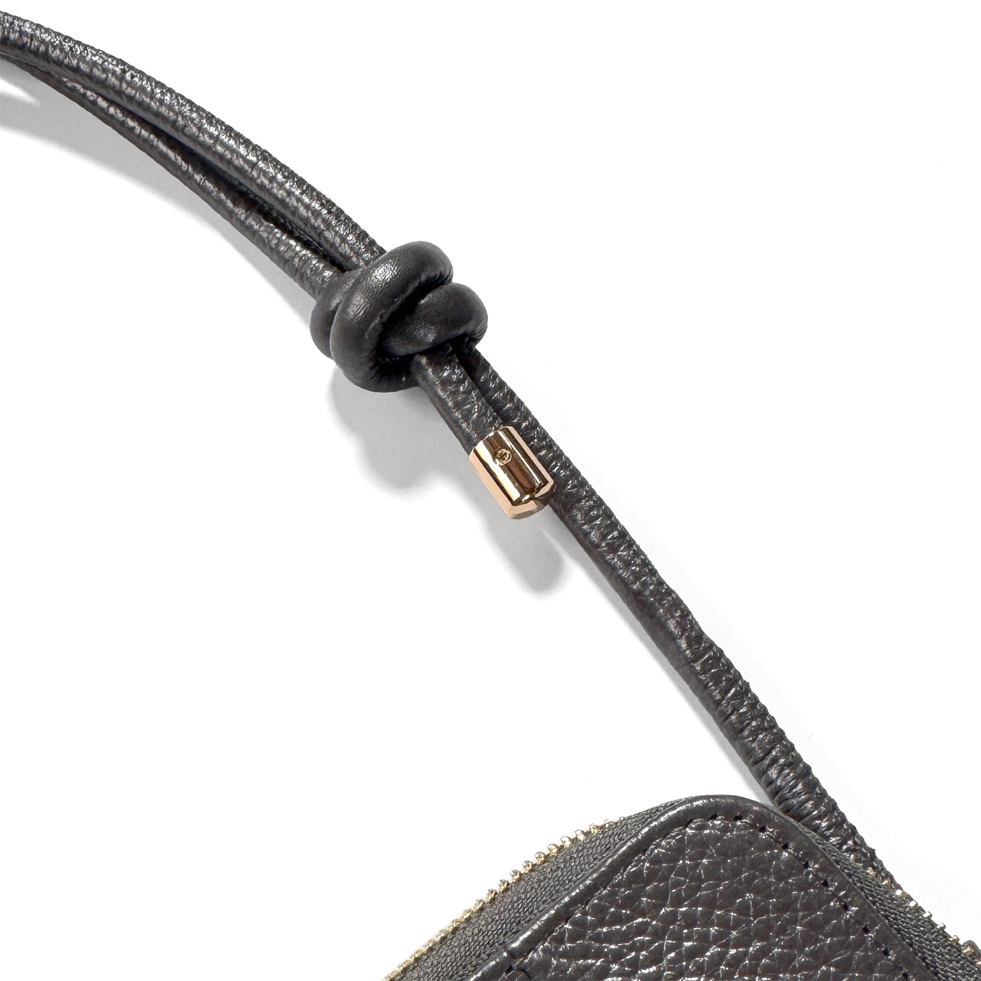 細い紐状の本革ショルダーストラップは、結び目の部分を移動させて、長さ調節可能です