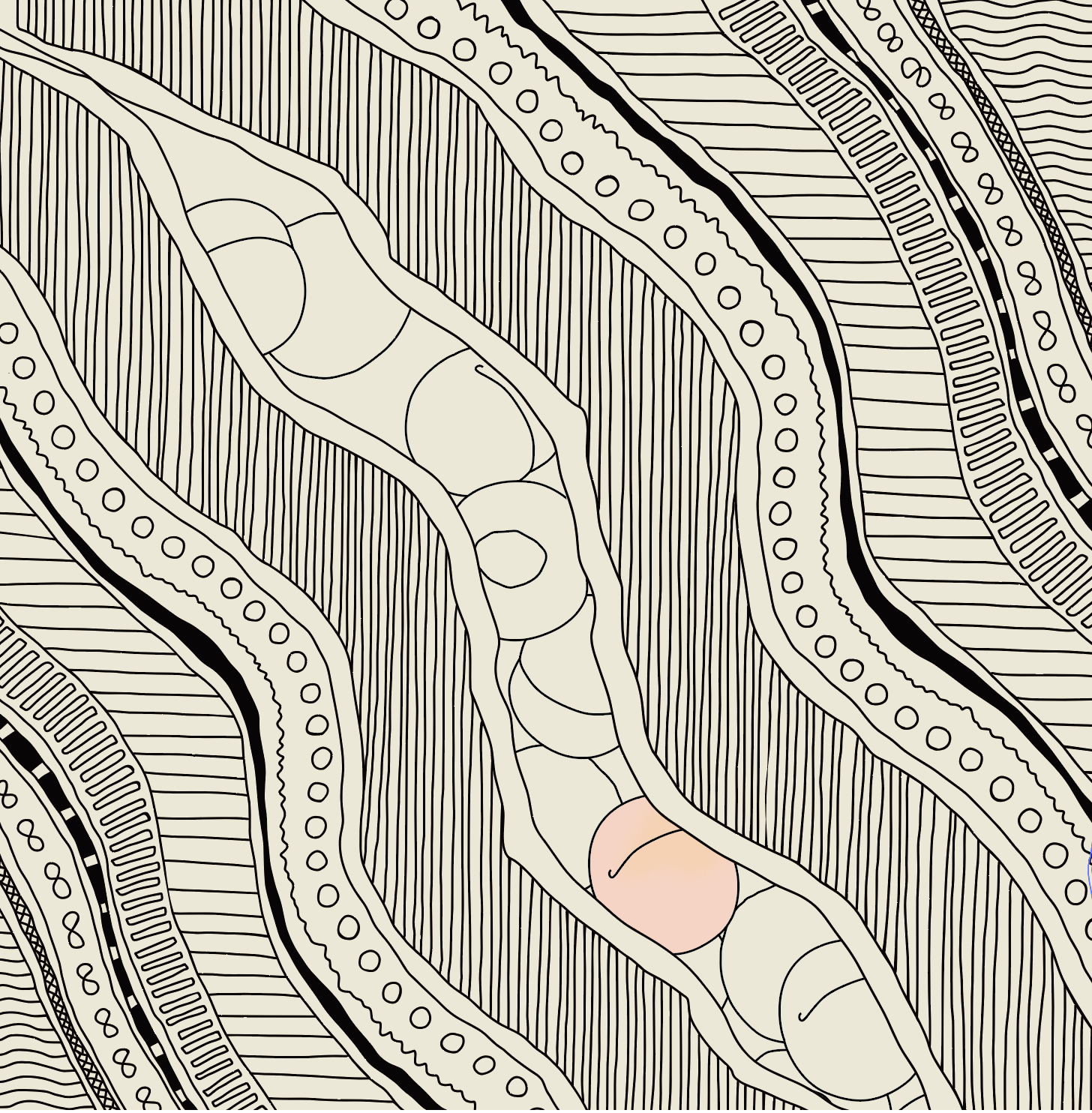 よく見ると、川を流れるピンクの桃が