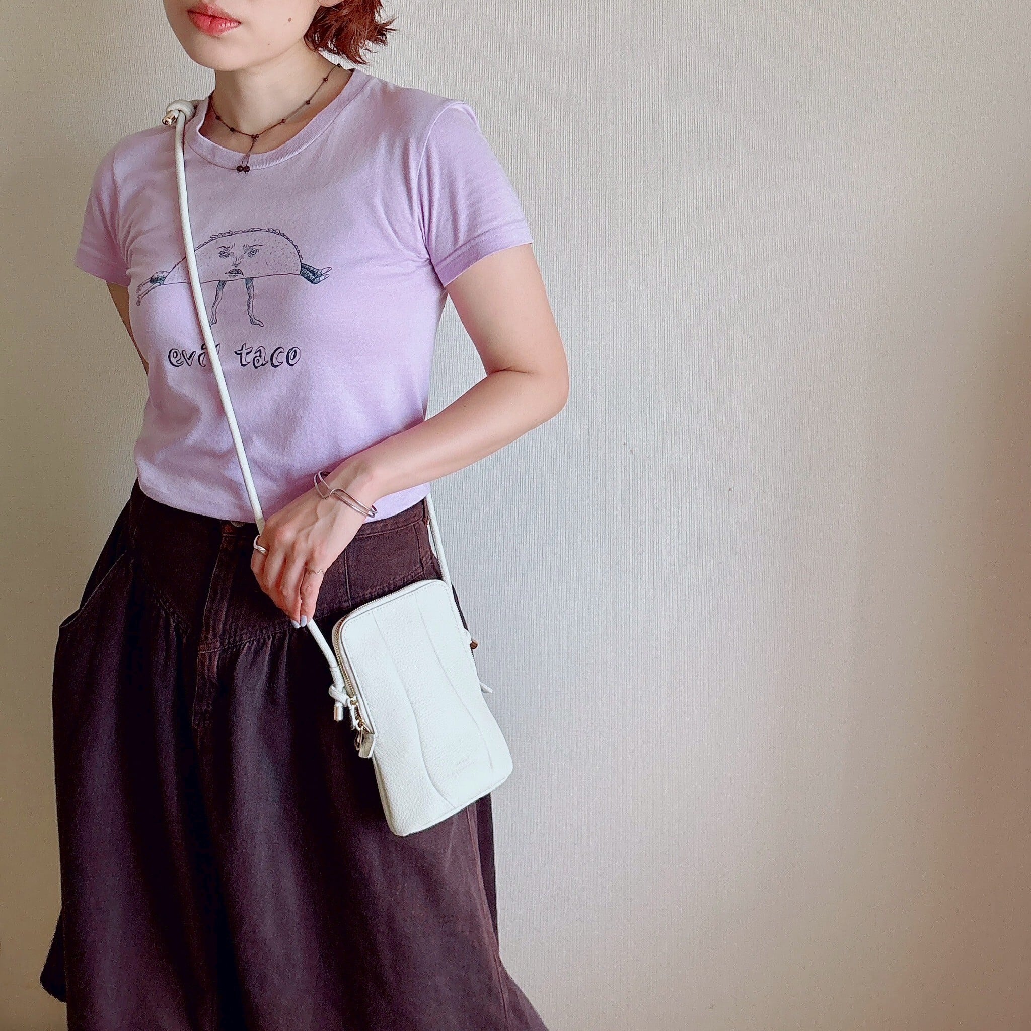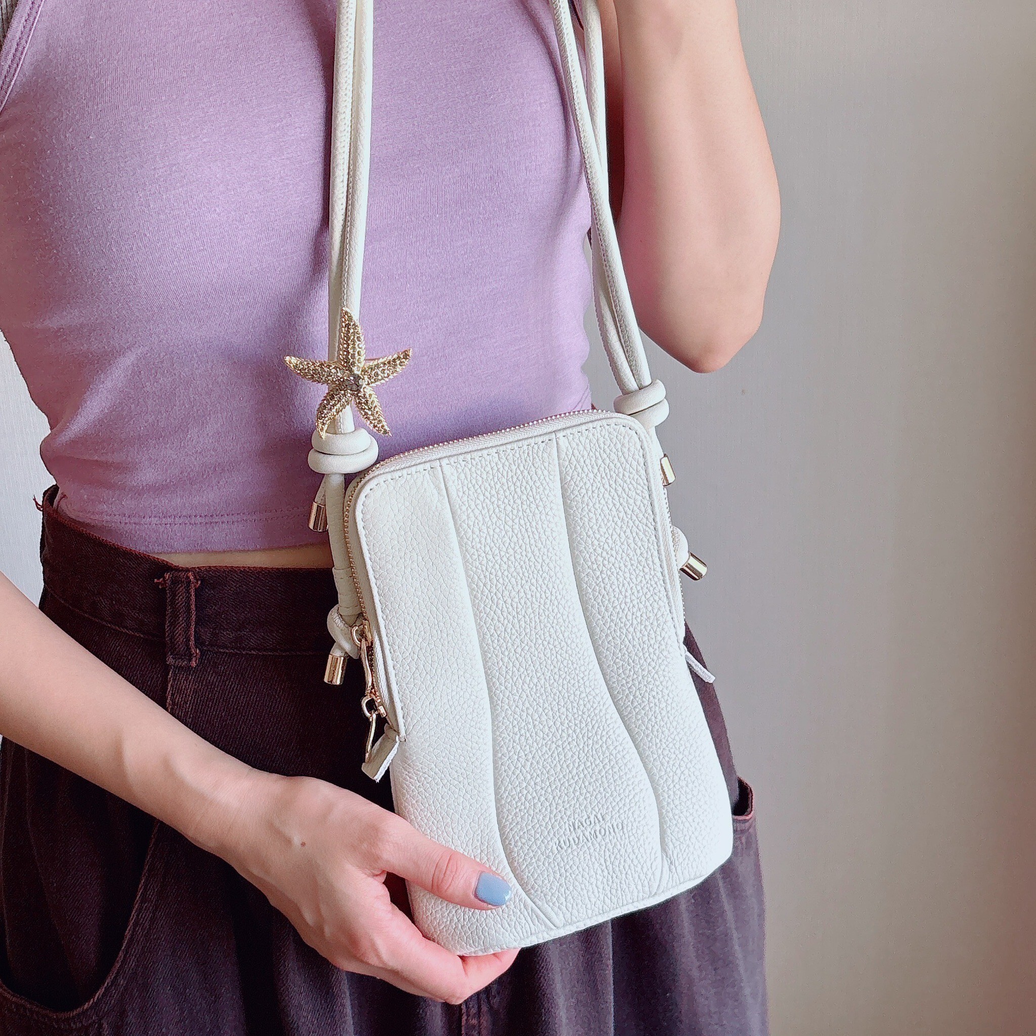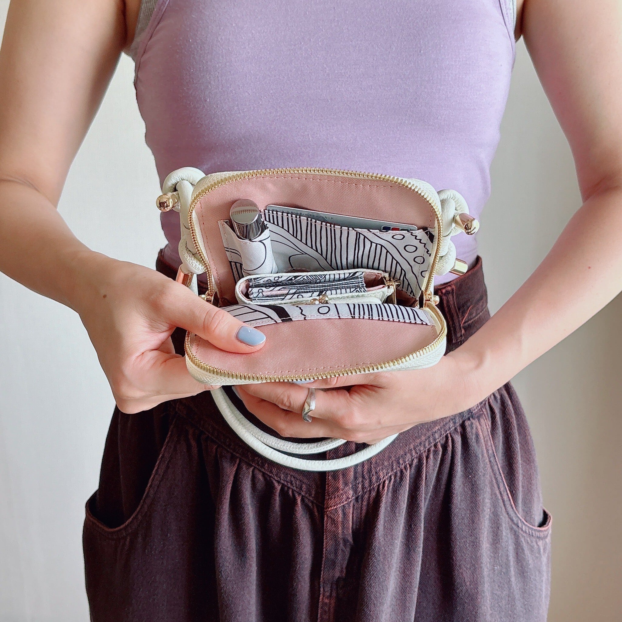 ショルダーバッグにはスマホ、ミニ財布、カード、リップクリームなど、必要最低限の荷物を小さく収納できます