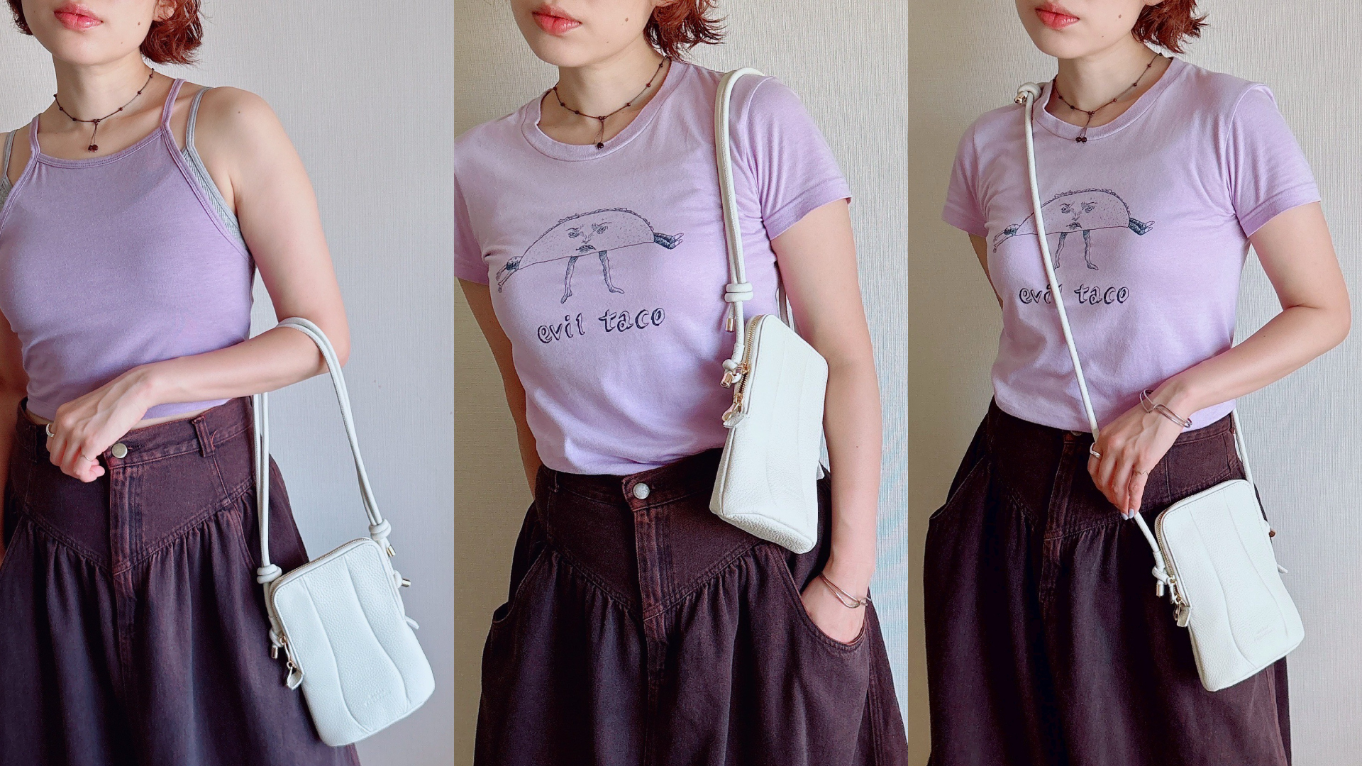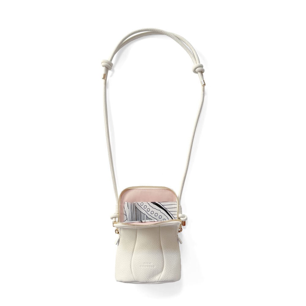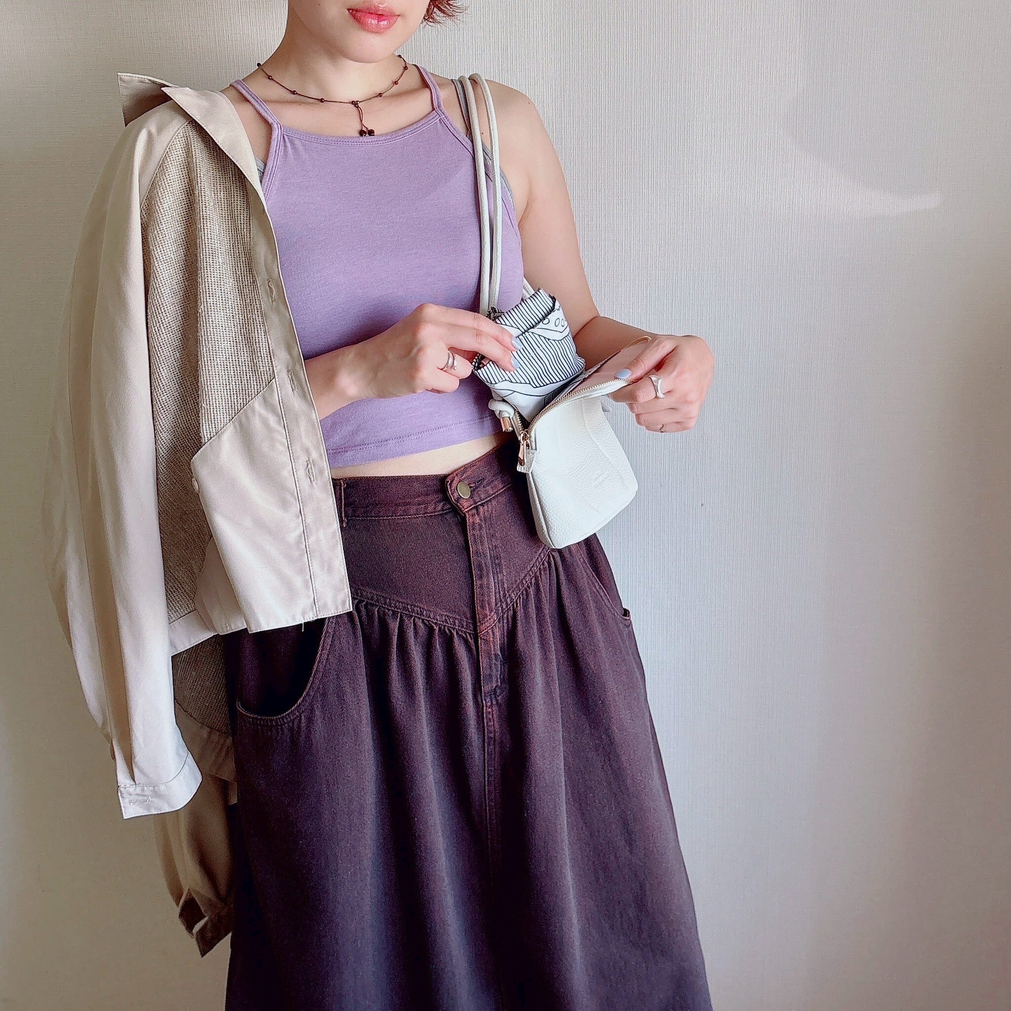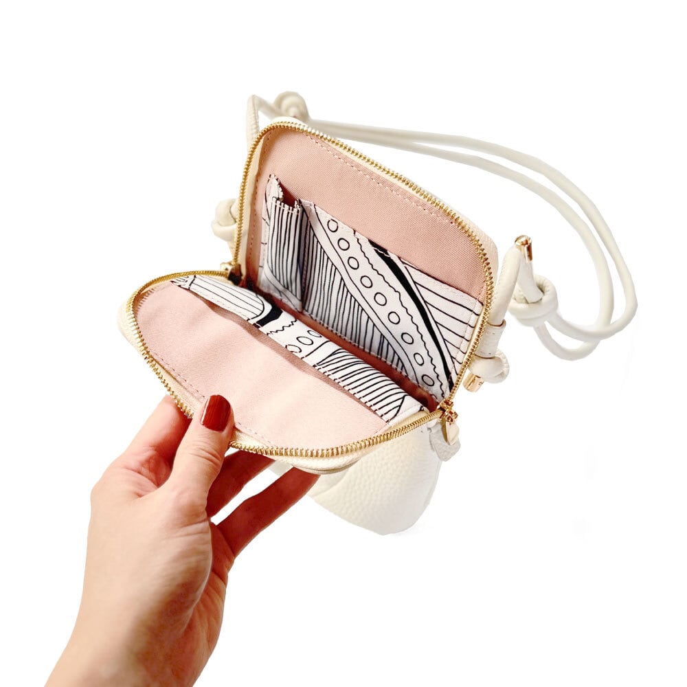 ショルダーバッグにはスマホ、ミニ財布、カード、リップクリームなど、必要最低限の荷物を小さく収納できます