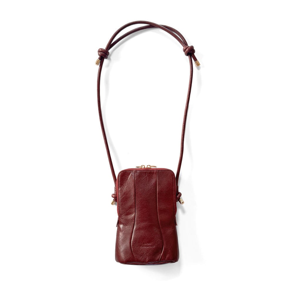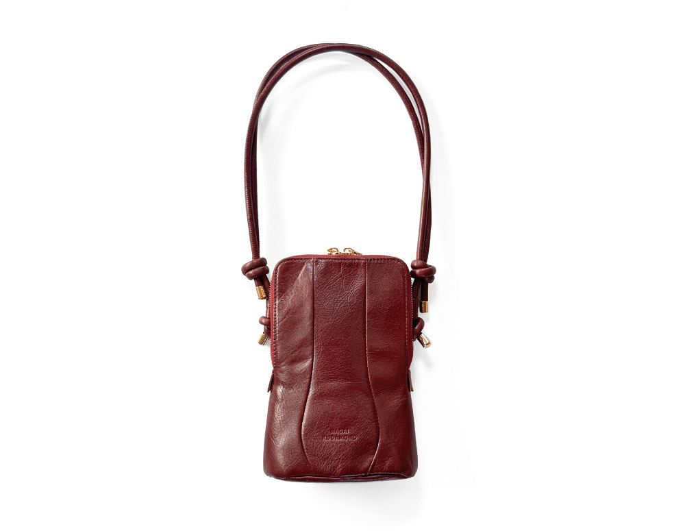 細い紐状の本革ショルダーストラップは、結び目の部分を移動させて、長さ調節可能です