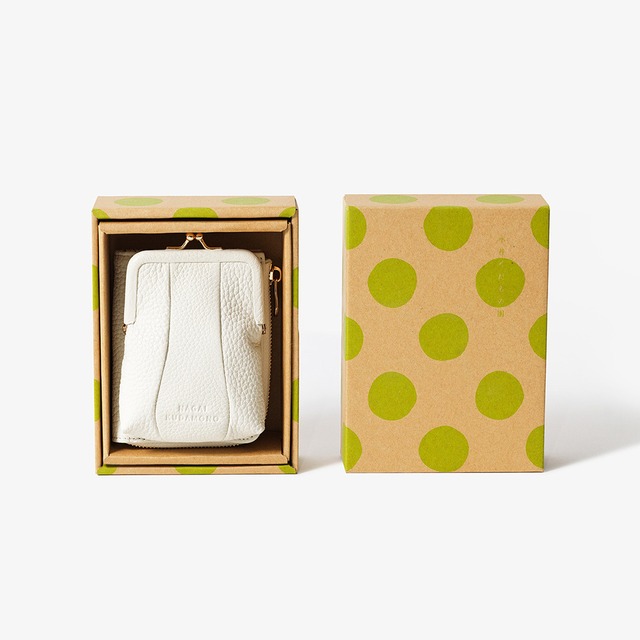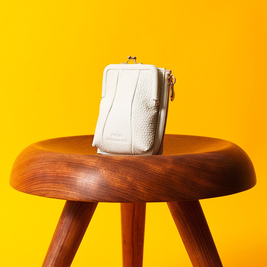 正面のがま口ポーチは、カードや小物をたくさん入れても型崩れしづらい、ぽってりした独特なかたち